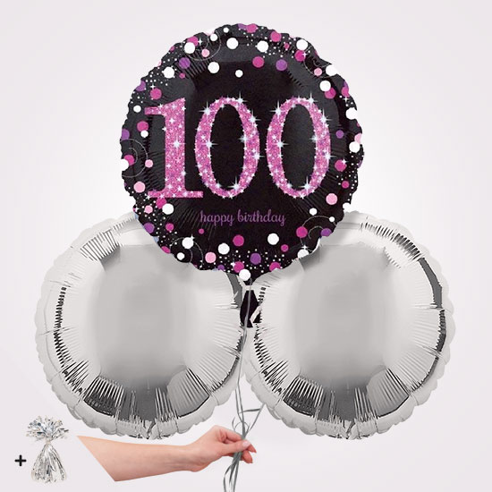 The 100th Pink Sparkles Foil Balloon Bouquet is a really fun gift for a birthday celebration. We can send the balloon bouquet directly to the persons home or workplace with a message from you. The balloons all come inflated with helium and tied with balloon ribbons. A balloon weight is attached to keep them grounded.