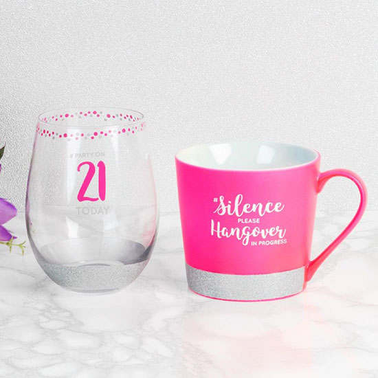 21 Today Hangover Stemless Glass – The perfect wine glass for celebrating on someone’s 21st Birthday and mug for recovering the morning after. The stylish stemless wine glass features a neon pink ‘#Party on 21 Today’ design with silver glitter base. The mug features a neon pink design with white ‘#Silence please hangover in progress’ wording. Perfect for a birthday gift it also comes in attractive matching packaging.