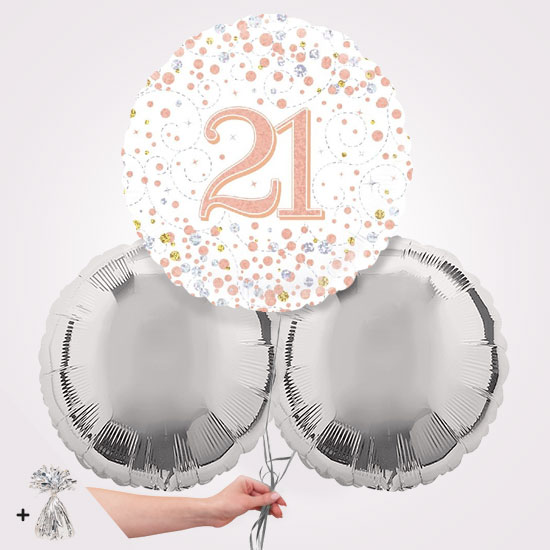 The 21st Happy Birthday Sparkling Fizz Foil Balloon Bouquet is a really fun gift for a birthday celebration. We can send the balloon bouquet directly to the persons home or workplace with a message from you. The balloons all come inflated with helium and tied with balloon ribbons. A balloon weight is attached to keep them grounded.