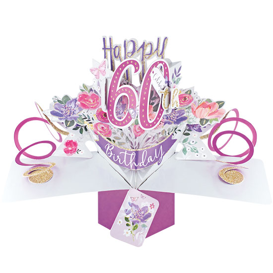 Not just any card, this award winning Pop Up greeting card jumps to life from its envelope! The 60th Birthday Pop Up Card (Flowers) is a wonderful personal gift to treasure and can be kept flat for mailing in its envelope or stored as a keepsake. This design has a blank panel and a gift tag which can be used for a personal message. Just close the Pop Up flat and write your message in the panel/tag provided before placing in the envelope for mailing.