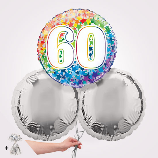 The 60th Happy Birthday Rainbow Stars Foil Balloon Bouquet is a really fun gift for a birthday celebration. We can send the balloon bouquet directly to the persons home or workplace with a message from you. The balloons all come inflated with helium and tied with balloon ribbons. A balloon weight is attached to keep them grounded.