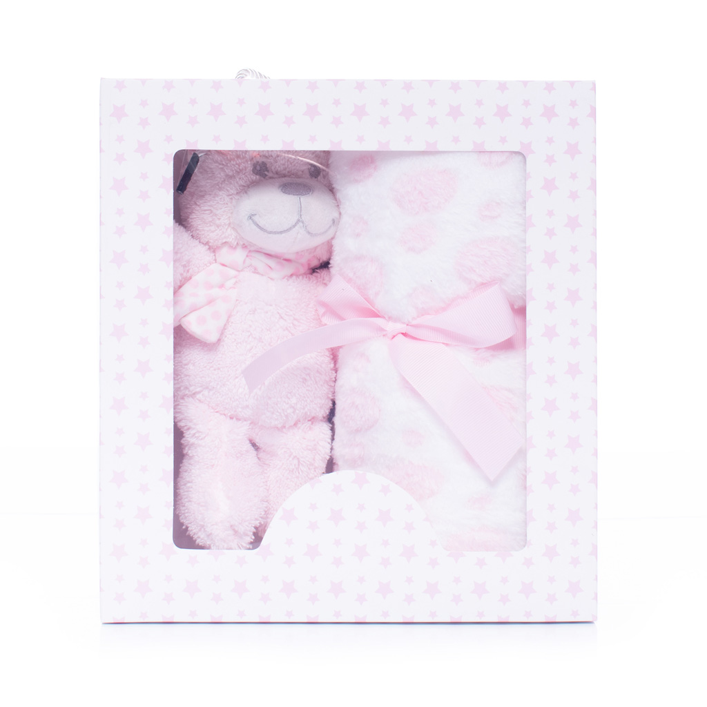 Baby Pink Teddy with Polka Dot Blanket in Gift Box – treat a special newborn to an adorable welcome gift with this lovely plush teddy