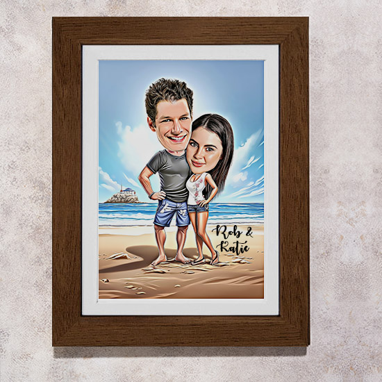 The Beach Goers Caricature is a really fun and unique personalised gift.  Please note: When you order we will replicate the design you see in the large image. Your artwork will also have the gentleman in a t-shirt and shorts, the lady will be in a sleeveless top and shorts and they will have their arms around each other. We will redesign the picture so it has your uploaded heads instead. Artwork Size: A4 (210mm x 297mm) Includes a beautiful mounted frame.