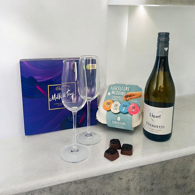 🥂 Two personalised champagne flutes, engraved with your chosen names or message for a timeless keepsake.
