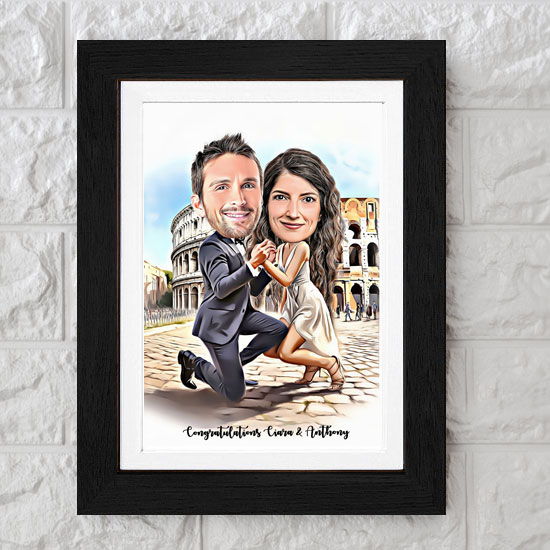 Our Engaged in Rome Caricature is a really fun and unique engagement gift for a couple that got engaged in Rome. Please note: When you order we will replicate the design you see in the large image. Your artwork will also have the gentleman on one knee, the lady in a dress and Rome in the background. You can choose the dress colour. Includes a beautiful mounted frame that can be free standing or wall mounted.