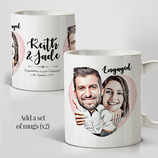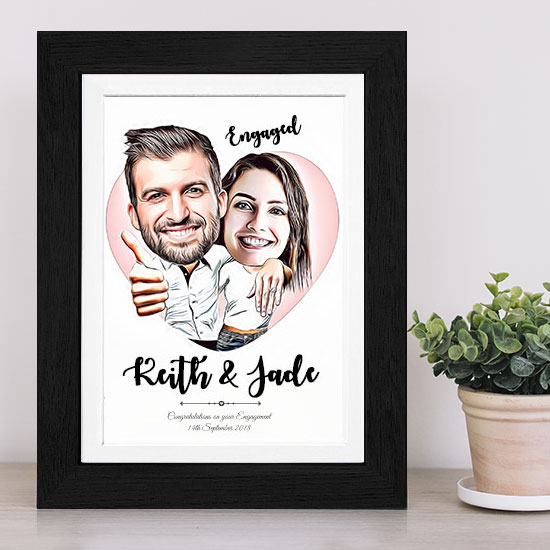 Our Engagement Caricature is a really fun and unique engagement gift. Please note: When you order we will replicate the design you see in the large image. Your artwork will also have the gentleman with the thumbs-up, the lady will be showing off a ring and the background will have a heart. We will redesign the picture so it has your friend’s heads instead. Artwork Size: A4 (210mm x 297mm). Includes a beautiful mounted frame that can be free standing or wall mounted.