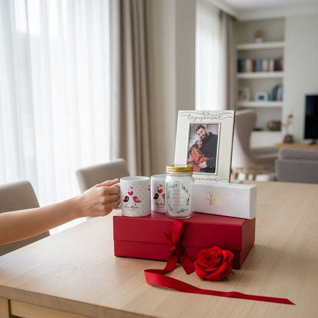 Thoughtfully curated with sentimental pieces and romantic touches, this hamper is perfect for newly engaged couples to treasure during this exciting chapter. From personalised mugs for cosy moments together to a glowing keepsake jar and a frame ready for a favourite photo, every item is chosen to celebrate love and the journey ahead.