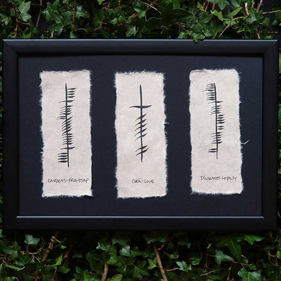 Friendship Love Loyalty (Large) – Loyalty triple Ogham Wish combination is a unique and affordable gift, perfect for weddings or anniversaries. The traditional claddagh combination of wishes are hand-painted on a single piece of handmade paper and framed in a sleek black frame.