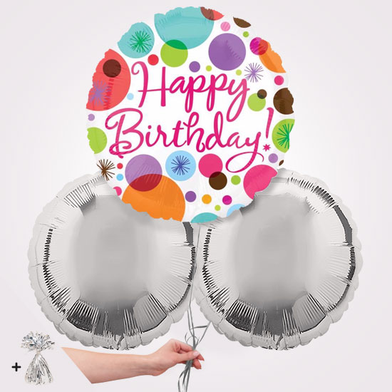 The Happy Birthday Polka Dots Foil Balloon Bouquet is a really fun gift for a birthday celebration. We can send the balloon bouquet directly to the persons home or workplace with a message from you. The balloons all come inflated with helium and tied with balloon ribbons. A balloon weight is attached to keep them grounded.
