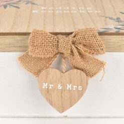 – 3D white wooden heart clasp with MR and MRS title and hessian bow hanger
