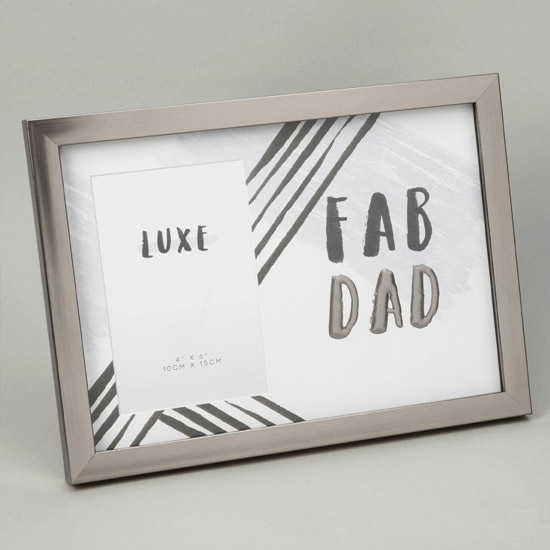 Give a precious pic with your ‘Fab Dad’ pride of place in this gunmetal grey 4″ x 6″ photo frame. From Hotchpotch Luxe by CELEBRATIONS® – occasionware with love from the cutting edge of London style. The frame features a stylish grey border and a mount with luxury embossed foil titling. Complete with a standing strut and corner box to make the perfect Father’s Day or Birthday gift.