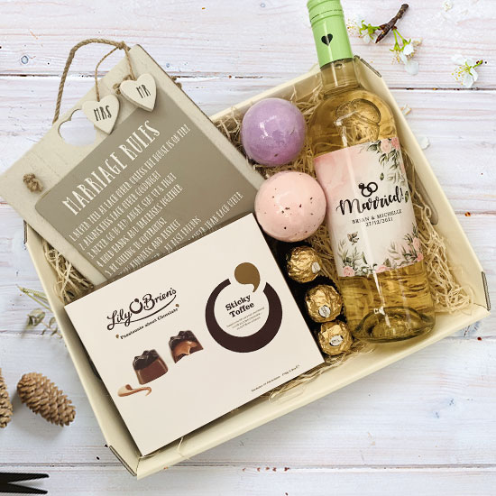 The beautiful “Married Marriage Rules Hamper” comes in a beautiful hamper box that is complete with a bow.