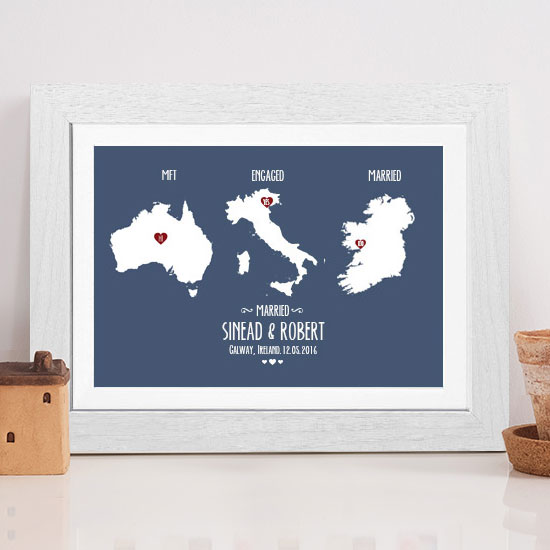 Our Love Story Wedding Gift – is a cute keepsake gift that tells the happy couples love story and a great gift for any couple to receive on their wedding day. You can choose any countries you like. Make sure to add the town or city so we can place a heart on the exact locations.