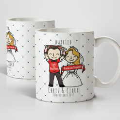 Stunning, Wooden Small Wedding Day Keepsake Box, Bound in White and Grey Faux Leather, Polished Metal Buttons With Personalised “The Supporters” Mugs. The mugs are not limited to county teams. We can do local teams, national teams or soccer teams.