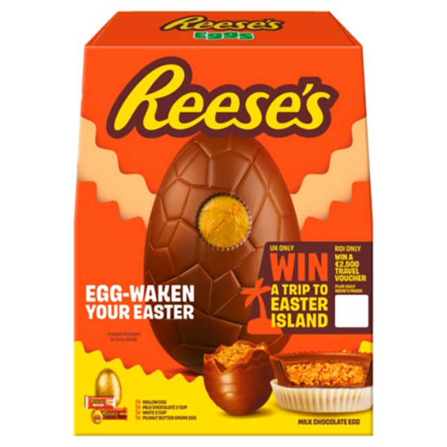 Contains a milk chocolate hollow egg along with Reese’s Milk Peanut Butter Cups 42g, Reese’s White Peanut Butter Cups 39g and Reese’s Creme Egg, all absolutely filled with Peanut Butter.