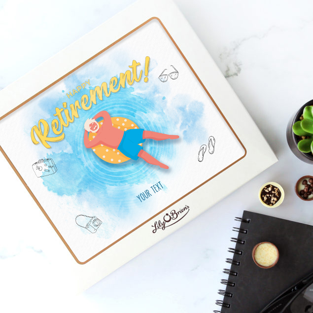The Retirement Choc Box Design 2 for him – This Personalised Chocolate Box is filled with 30 chocolates from our Petit Indulgence Collection including; Sticky Toffee, Simply Chocolate, Raspberry Creme, LeCrunch Chocolat, Chocolate Orange and Rich Praline.