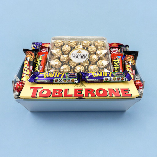 The Chocolate Heaven Collection Hamper – Comes in a hamper with a full size Toblerone, bog box of Ferro Rocher and a mix of full size chocolate bars.